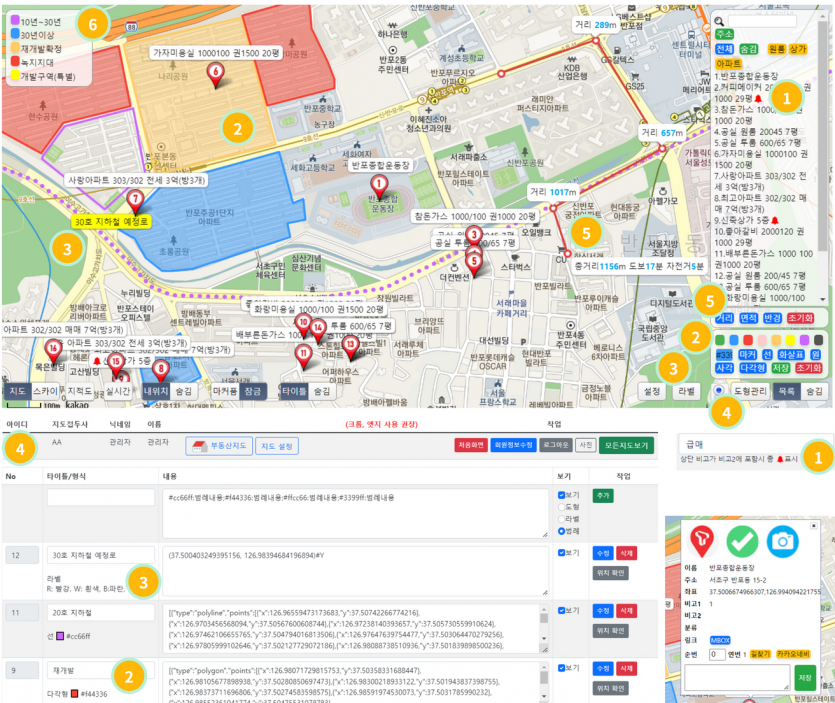 기존 나만의 지도만들기W 에서는 현황(구역, 라벨등) 표현기능이 없어 부동산, 임장지도, 현황 지도에 활용할수 있도록 도형그리기 및 저장 기능을 제공합니다.
