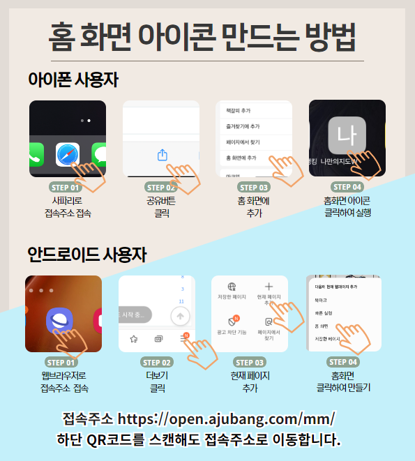 스마트폰 홈화면 아이콘 만드는 방법입니다. 페이지 정보 작성자 아주방 작성일 23-10-07 09:07 조회 611 댓글 0 본문 접속주소는 : https://open.ajubang.com/mm 스마트 폰에서 아이콘을 만들어 사용하시면 편리합니다. 네이버, 카카오 자동로그인을 활용하시면 바로 로그인됩니다. 이전글 기능개선(작은 아이콘, 외부지도 연결, 작업 완료 수 표출 등) 업데이트 알림 다음글 기능안내 (대형 지도만들기) 댓글목록 0 등록된 댓글이 없습니다.